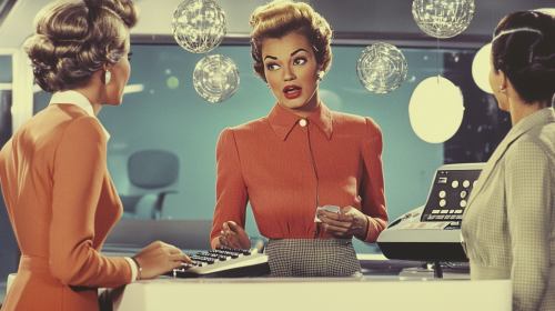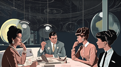 1950s Retro-Futuristic Office Discussion Between Diverse Colleagues
