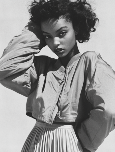real 1952 black and white photograph of a 36 year old Ethiopian Camren Bicondova wearing a bomber jacket and short pleated skirt, pushing her hair away from her face --ar 3:4