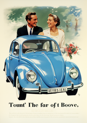 a 1960s magazine advertisement, the car should be blue, for the Volkswagen beetle, with a happy couple, and words --ar 10:14