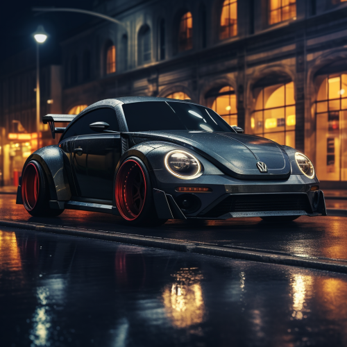 a VW new beetle, like a batmobile, with black color, in the night, after rain, in asphalt, photorealistic, 4k