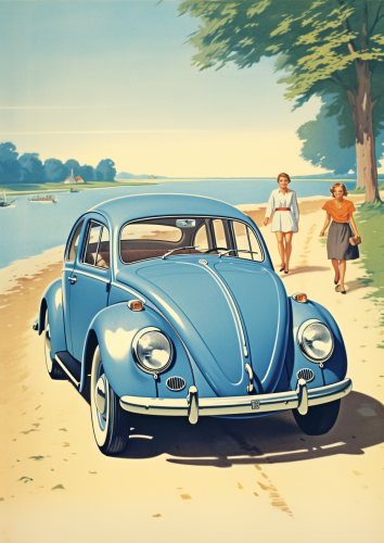 a 1960s magazine advertisement, the car should be blue, for the Volkswagen beetle, with people, and words --ar 10:14