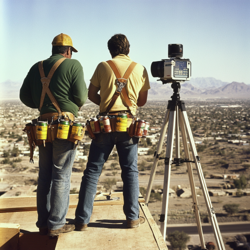 a behind the scenes photograph from 1975 of three men working hard on a residential deck project in a north american desert city in the summer. they have cans of beer attached to their toolbelt. there is a tripod with a camera on it with technology from the year 2024 that is located away from the men. the men are having a good time. --s 50