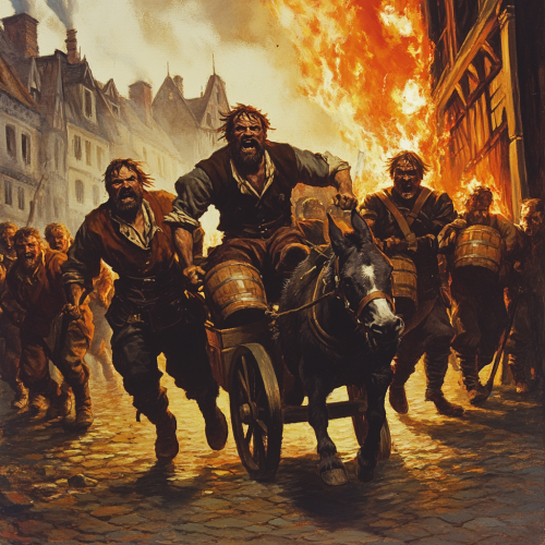 A group of burly bellowing men running alongside a cart pulled by a donkey, full of barrels, shovels and axes, rushing towards a burning building, intent on rescuing the people within.