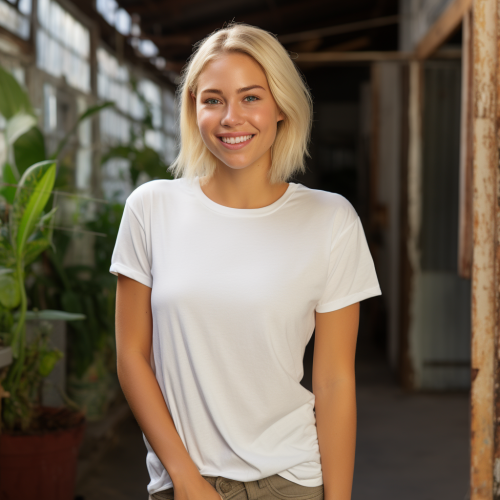 blonde 20 something model wearing a plain white tee shirt, happy with a cozy home background
