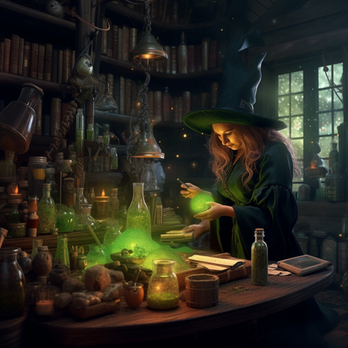 a Halloween witch, using a potion book to create a green bubbling liquid in a cauldron, behind her is a wicked looking house with potion bottles and spell books on dusty shelves, photorealistic --v 5.1