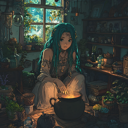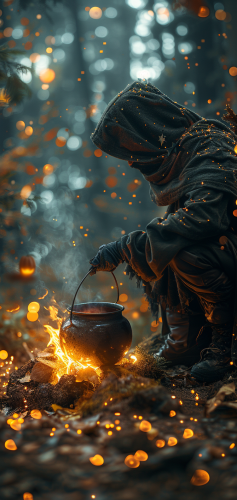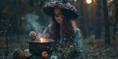 Beautiful witch with pointed hat decorated with flowers, making a magic potion in a cauldron, in the background a magical forest with the full moon illuminating the scene, captured by Canon EOS R camera with a 50mm f/ 1. 8 lens, f/ 2. 2 aperture, shutter speed 1/ 200s, ISO 100 and natural light, Hyper - Realistic Photography, Hyper detail, UHD, Color Correction, hdr, color grading, hyper - realistic photograph. --ar 2:1 --v 6.0