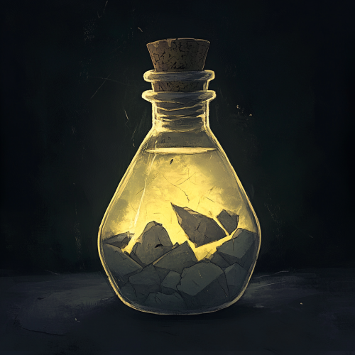 a dark fantasy illustration of a potion in a glass flask stoppered with a cork. The potion is a pale yellow with chunks of grey fabric in it. The potion is set against a dark background that highlights the potion as the center of attention