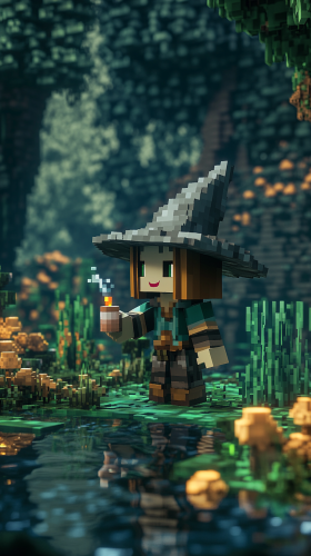 A female Minecraft character named Alex dressed as a witch with a pointed hat and holding a potion, surrounded by a swamp biome with dark oak trees, pixelated water, and mushrooms, all in Minecraft's blocky style, --ar 9:16