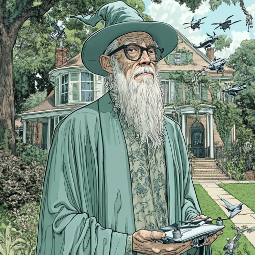 a 1950s style comic book graphic of a bearded old wizard standing triumphant outside his suburban home as his drones impeccably mow his lawn --weird 500