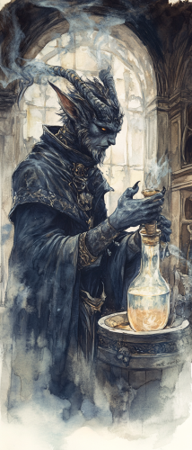 Tiefling alchemist brewing a potion. The mood is ethereal. Dark Fantasy setting. Watercolor art style with soft washes of color and fluid details. The watercolor background is inside a medieval building with partial white space. --ar 3:7