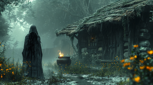 wide shot, hag, horrific and dominating, looking out from her hut, large cauldron, her hut is located inside a misty dark forest, dnd grim dark art, DnD atmosphere, 8k digital, super resolution, --v 6.0 --s 750 --ar 16:9