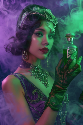 A woman holding a bottle of green potion. She’s dressed in vintage cabaret attire, with emerald gloves and a jeweled headpiece. Purple and green mist wafts around her, creating an air of mystery. vintage poster style. --ar 2:3 --v 6.0