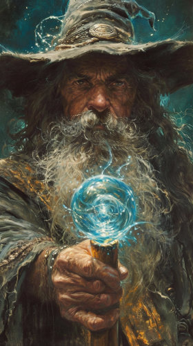 Clyde Caldwell fantasy lithograph, 1950s fantasy comic, short, dark-bearded human wizard, a magic staff made of glass, surrealism --ar 9:16 --s 250 --v 6.0