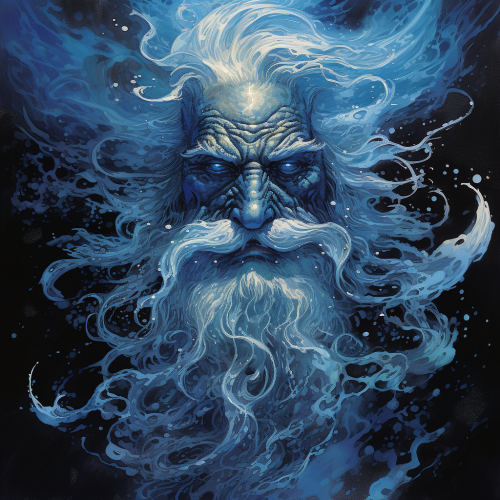 1970s dark fantasy dungeons and dragons style book art water elemental spirit that looks like a genie with a black flowing beard