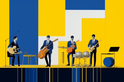 kraftwerk simple, geometric, 1970s soft drawing advertising style, band of older men playing keyboard, cello, trumpet on stage elegant color scheme, blue yellow grey --ar 3:2