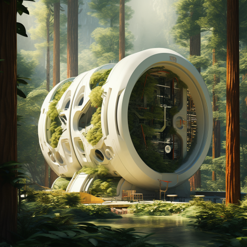 1970s sci-fi concept art style, outdoor forest and a large speaker box, zoomed out, solarpunk --ar 1:1