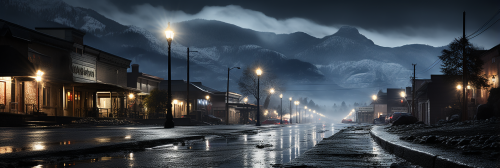 Christmas lights downtown in a mountain village in western North Carolina. Minimalist. Christmas decorations on street. Christmas decorations on storefront displays. Hallmark style. Black and white with vibrant color splash. Beautiful Cobblestone streets. Deep Snow on the ground. 8 inches of snow. Mountains visible in the distance. Snow visible on the mountains. White Christmas lights. Beautiful Sunset. Award winning photo. Cinematic. Photorealistic. Stylish. High - end. Important. Mysterious. Shot with a Pentax. K - 3 III Monochrome. --ar 3:1 --q 0.5 --s 750