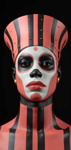 Black woman face, bauhaus style, pink stripes, jewelry by painters and sculptors, 1980s, jester, noses --s 750 --ar 9:19