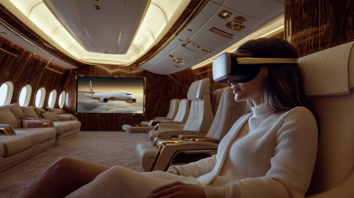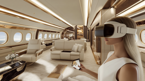 ultrarealistic, a person wearing VR Goggles and seeing the interior design of a VIP custom luxury interior of a boeing 777 widebody aircraft, 8l, --ar 16:9