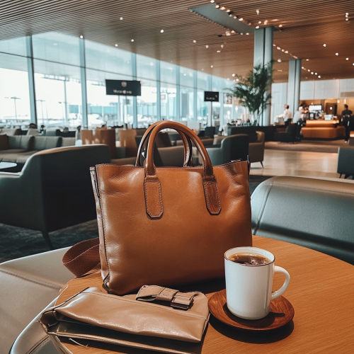 a selfie sryle photo showing the inside of an airport vip lounge. Modern interior. The table in front of where the photo is taken has a brown leather bag and a mug of coffee