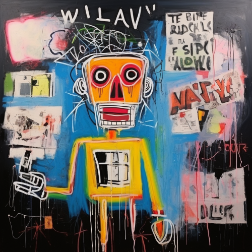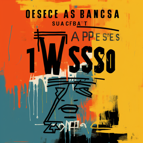 1980s Basquiat Party VIP Access poster with text: - Create a VIP Access poster from the 1980s featuring Basquiat that forms an upside-down triangle with a slight curve in the lower middle. ## Text Placement: - Place large, bold text at the top of the Basquiat image, creating a clear focal point. ## Central Image: - Incorporate the central image of a VIP access poster juxtaposed with text, forming the heart of the design. This central image should showcase the core message of the logo, reflecting the 1980s sports theme. ## Text Hierarchy: - Position smaller text below the central image. This text should feature text quotes related to sports or the 1980s, creating an engaging visual hierarchy within the logo. By following this comprehensive prompt, you can effectively design a logo that embodies the essence of the 1980s sports theme, with Basquiat as a central figure, and conveys your intended message and visual hierarch