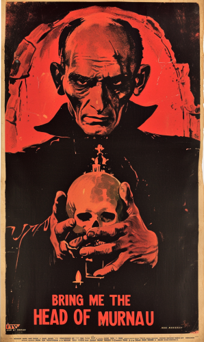 a 1980s cult film poster for "BRING ME THE HEAD OF FW MURNAU" of Nosferatu in Berlin at a techno club holding a skull --ar 3:5 --v 6.0 --style raw --s 50