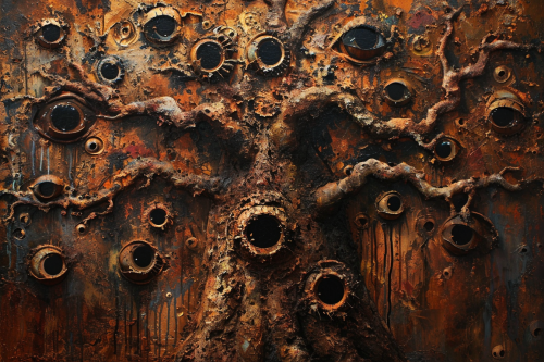 a tree made of eyes, made out of rusted metal, cosmic horror, gothic, 1980s movie, 1980s horror film art, 1980s film poster art, technicolor film, high detail, high resolution --ar 3:2 --v 6.0