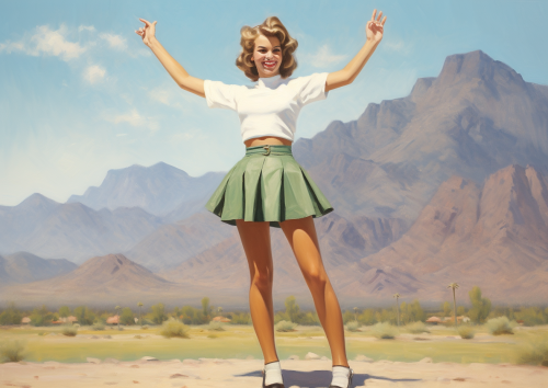 **oil painting of a happy cheerleader, posing, on football field, 15 years old, white shoes, green skirt, white shirt, cute, in the 1960s, Tucson, saguaros, Sonoran desert, vintage, in the style of Norman Rockwell painting, nostalgic illustration --ar 7:5