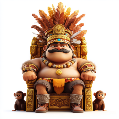 man, king on throne, fat, golden throne with indian pattern, crown with feathers, aztec style, el dorado,monkeys are sitting nearby, pixar style, cartoon, game props, game art, stylized details, high quality, artstation hd, soft light, colors, on a white background, three quarter angle, angle slightly from above,