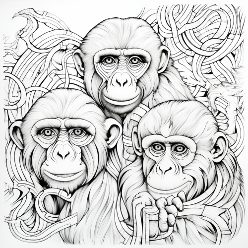adult coloring page, bold clean lines, black and white, no shading, monkeys