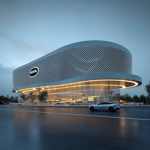 Create a Kia Motors architectural structure that reflects the design philosophy of 'Opposites United,' which harmoniously combines contrasting concepts to achieve a unique and innovative design