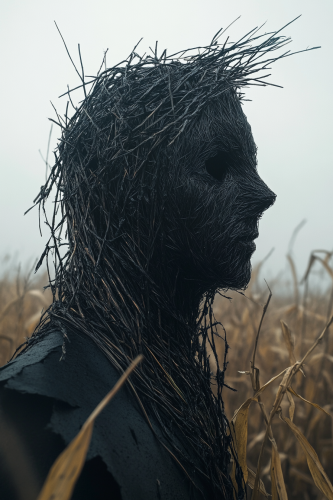 surrealistic, horror movie style, side view, profile view, corn field, straw man, voodoo, made of sticks, crows, evil, exorsism, gothic, photorealistic, Leica M10-R 8k Leica 35mm lens, Tilt Blur, Shutter Speed 1/ 1000, F/ 5.6, Super - Resolution, --ar 97:145 --s 250 --v 6.1