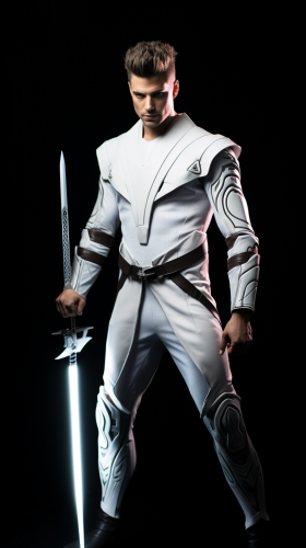 Full body action pose, stepping forward confidently, studio portrait of a futuristic space captain, rougish, last human alive, male, handsome, henry kavil, dynamic pose, action, plain white background, neautral lighting, studio photography, scifi action movie, glowing sword --ar 9:16 --v 5.2 --style raw