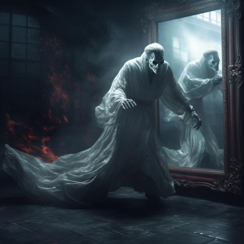 malevolent ghost crawling through a mirror. action pose. threatening.
