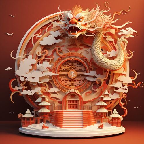 A three-dimensional folding greeting card with the theme "2024 Happy New Year" (a Chinese dragon, combined with 3D model elements) (the background has clouds and sunshine combined with 3D miniature model elements), high quality, high details