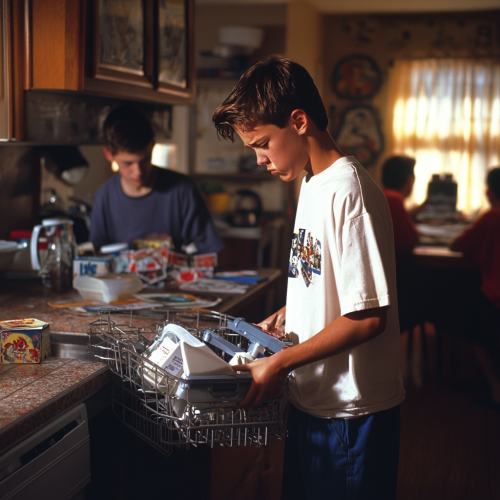 an upset skinny average looking 14 year old kid emptys a dishwasher in a texas 1990s suburban home while his friends play card games at the kitchen table in the background