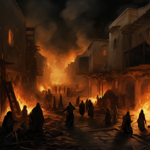 A haunting sight of Thebes aflame. Buildings crumble, and thick smoke rises, casting a dark shadow. Distraught civilians flee, carrying whatever belongings they can salvage.