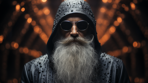 Santa Clause dressed in his suit on Christmas Eve. Abstract minimalist with fractal patterns. Black and white. Stylish. High-end. Important. Mysterious. Shot with a Pentax. K-3 III Monochrome. Extreme low angle shot. Shooting straight up. --ar 16:9 --q 0.5 --s 750