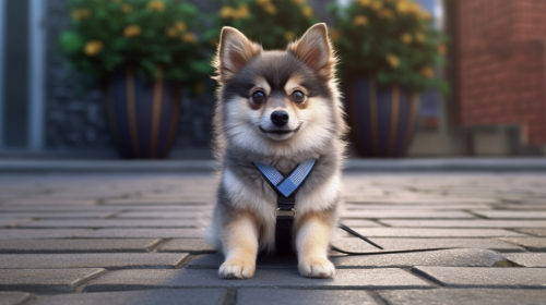4. Lovable Pomsky with blue harness and captivating eyes