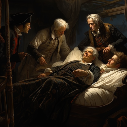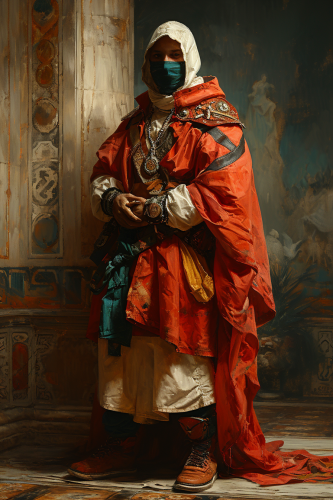 Renaissance painting of a man in contemporary streetwear, wearing a minimal wool Nike jacket with a cape, a balaclava, and Nike sneakers. standing in between royal family --ar 2:3 --v 6.0 --s 750