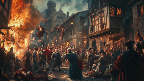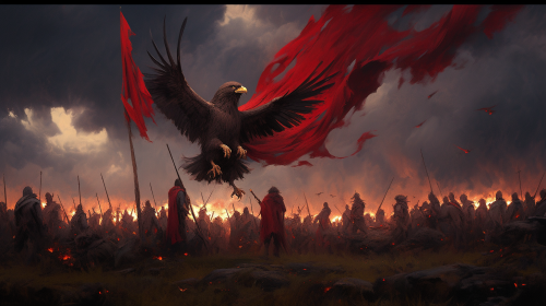 Medieval Red flag with golden eagle, chiaroscuro, tenebroso, detailed scene illustration,digital art painting, hyperrealistic, chiaroscuro, tenebroso, dark, dramatic, scene illustration, digital art painting, hyperrealistic, on Kingdom Come: Deliverance style, on witcher 3 style --niji 5 --ar 32:18