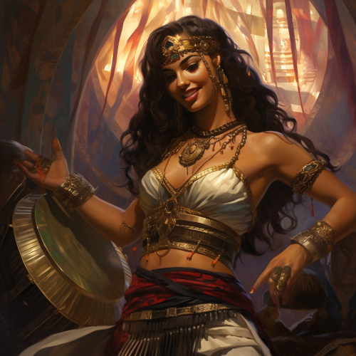 a beautiful atheltic egyptian belly dancer wielding poison tipped daggers, proud smile, high definiton, style of a reinaissance painting