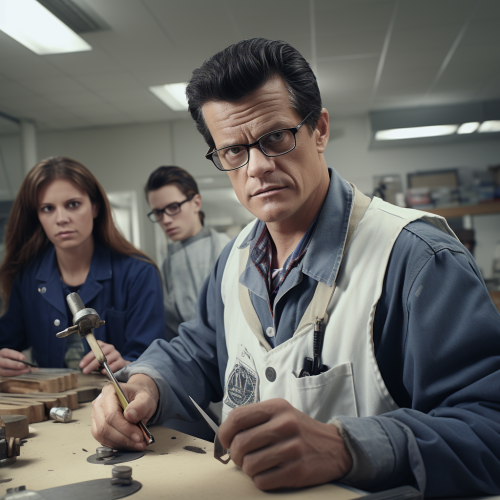 Johnny Knoxville high school shop teacher, a bandsaw and student clutching his hand in pain in the background depth of field, photorealistic, hyperrealistic, 70mm lens, 16k resolution, 8:6, white artificial lighting, natural shading, highly detailed, high definition, style 1200, v 6.0
