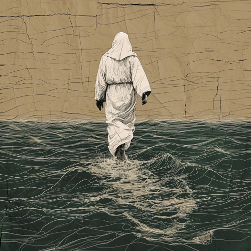 A line drawing of Jesus walking on a vast ocean, in one-line drawing, octane render, figure outline only, single line, simple, in the style of one-line, single line drawing, black line, browns and greens, whites, clean lines, minimalistic, simple, Picasso one line drawing war and peace style --stylize 250 --v 6.0