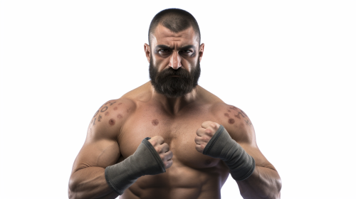 an italian mma fighter in guard pose with hands on white background, hight detailed, 4k, --ar 16:9 --style raw