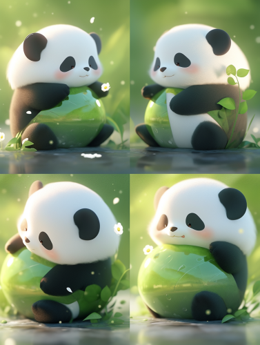 A cute panda, looking at the camera standing natural and full, bubble mall style, clean and concise design, IP blind box image, high- end natural color matching, bright and harmonious, lovely and colorful, detailed character design, behavior, Shanghai style, organic sculpture, C4D style, 3D animation style character design, cartoon realism, interesting character setting, Light tracing, children's book illustration style,Three View --s 750 --niji 5 --ar 3:4