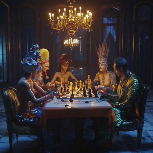 4 models sat around the table, dressed as characters from the 12 days of christmas, they play a high stakes game of 3D chess, in the stytle of 3d star trek chess, but with more levels, at night, lit by candleabras, cinematic, hyper deatailed, in the style of the film saltburn