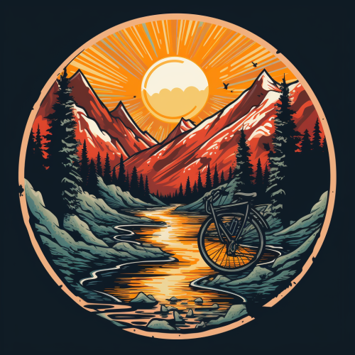 circular vector logo of mountain bike and dirtbike mountains in the background sun shining through trees and waterfall in the background