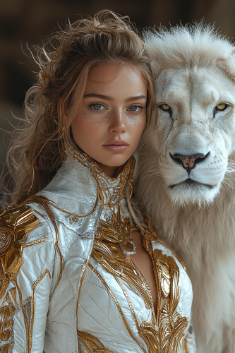 fullbody young woman ready to go out, gold and white design style, futuristic look, jewel, young people having fun the design style, asthetically inspired by arnaldo pomodoro. At the futuristic fashion week of the 2080s, gorgeous amazonian warrior model a full body photo in high definition and high resolution. near to the model a white lion with a magnificent coat parades alongside and protects the model. The show is set in the Bad Max move. photorealistic, hyper realistic, surreal, 8k, 16k, extremely detailed::5 --ar 2:3 --seed 100 --quality 2 --stylize 1000