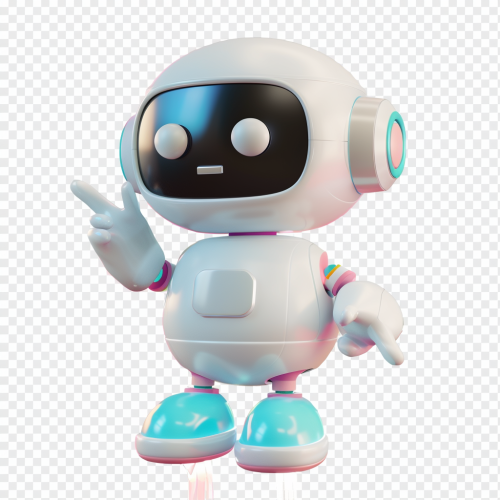 A 3D, friendly AI chatbot similar to the one in the provided references, isolated from the background, with a smooth, rounded design and a glossy finish. The bot features a white and pastel blue color scheme, with a cute digital face displaying a smile. The bot is posed in a welcoming gesture, waving or extending one arm forward. The background is completely removed, allowing the bot to be placed on any webpage or asset. clean, glossy 3D design, isolated on transparent background, playful pose, hd quality --ar 1:1 --v 6.0